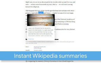 أحد الميزات الرئيسية لكيويكيبيديا هو قدرته على توفير ملخصات ويكيبيديا الفورية من أي موقع. سواء كنت تقرأ مقالًا أو مشاركة في مدونة أو حتى منشورًا على وسائل التواصل الاجتماعي، يمكنك بسهولة الحصول على مزيد من المعلومات عن طريق تمييز النص ورؤية ملخص موجز من ويكيبيديا.
